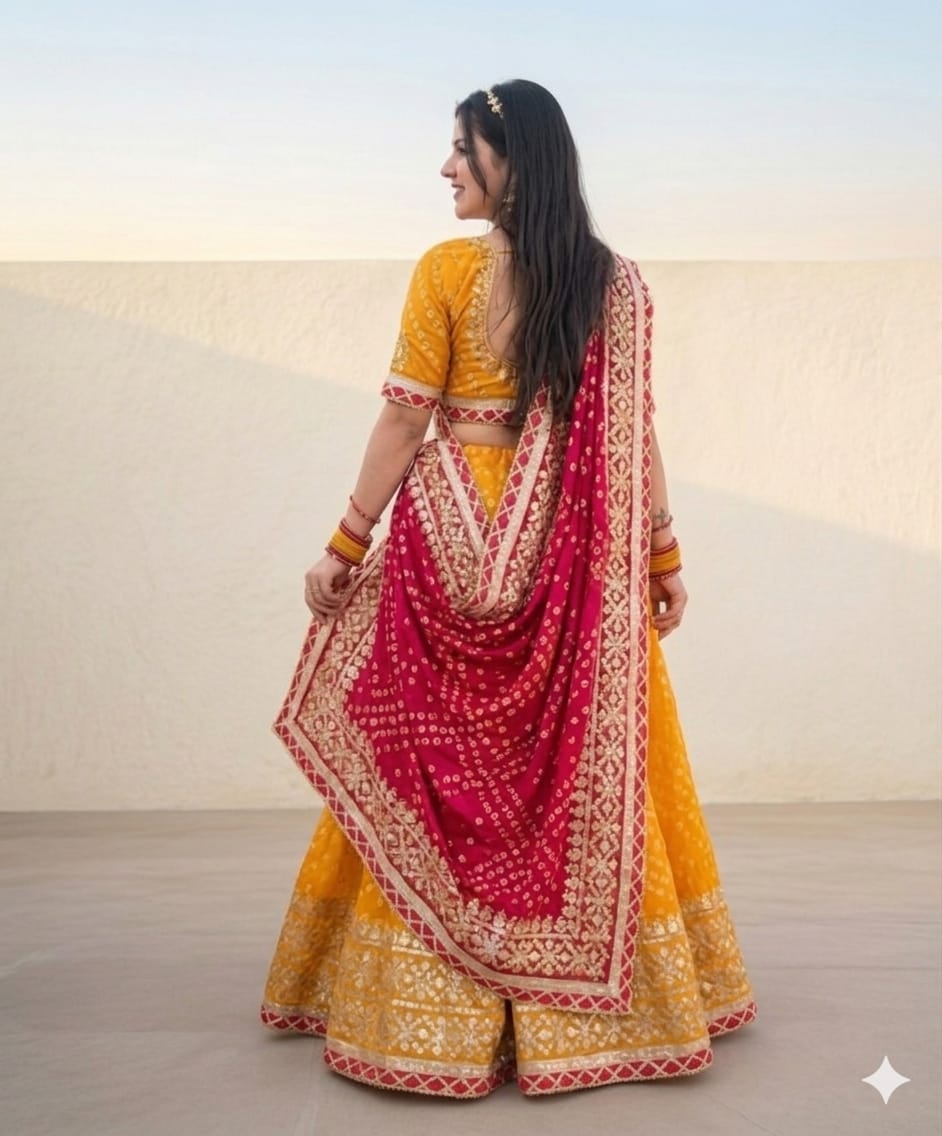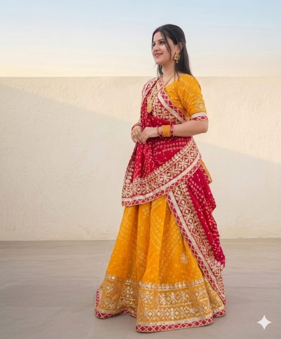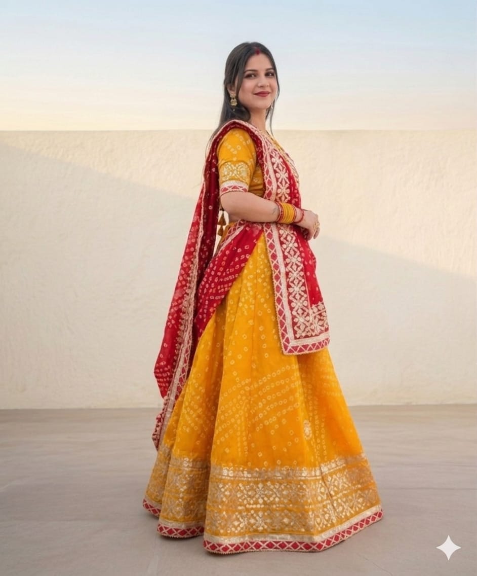 Add a touch of royal tradition to your wardrobe with this beautiful Rajasthani Bandhani Lehenga Choli. The outfit features a bright yellow flared lehenga paired with a stylish red Bandhani dupatta, creating a vibrant and elegant ethnic look. The traditional Jaipuri print and detailed border design give it a classic Rajasthani charm.
